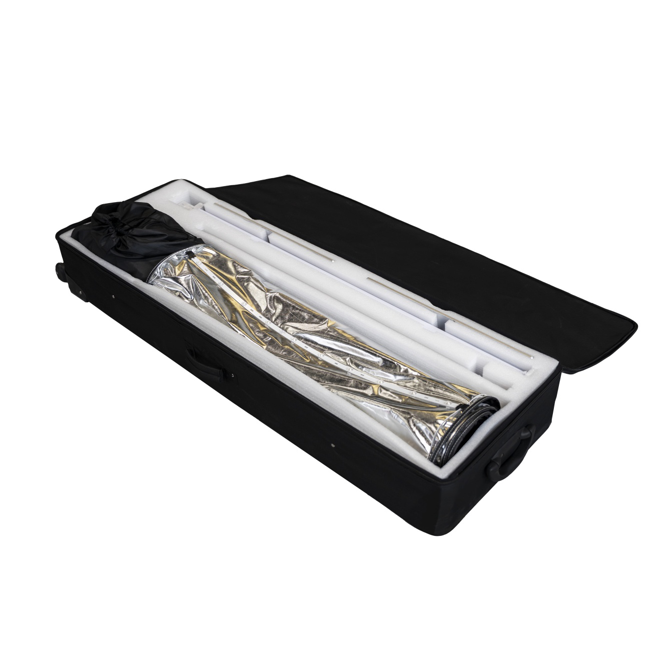 Lysboksen leveres med en praktisk transportbag med hjul. Monteringen skjer raskt og uten bruk av verktøy.