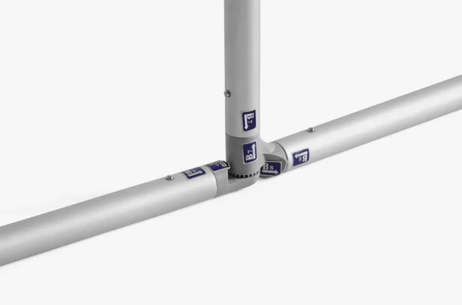 Den stabile aluminiumsstrukturen muliggjør verktøyfri og intuitiv montering. De enkelte rørene er tydelig merket og kobles sammen ved hjelp av spesialklips. Hele systemet er kompakt og får plass i en praktisk transportbag, noe som gjør det enkelt å frakte mellom ulike arrangementer.