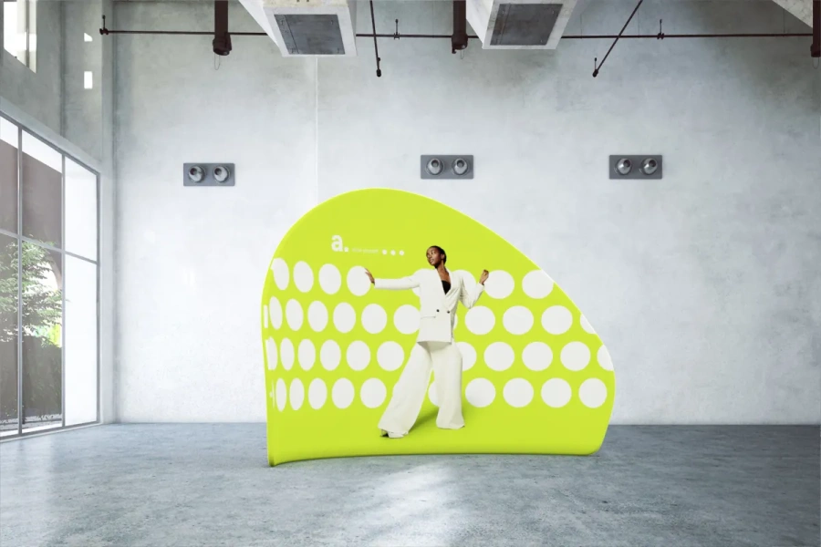 adWall Vario Peak-veggen skiller seg ut med sin unike, dynamiske form som umiddelbart fanger blikket. Den lett buede strukturen skaper et reklameområde hvor du kan sette opp standen din, brosjyrestativ eller promoterte produkter.